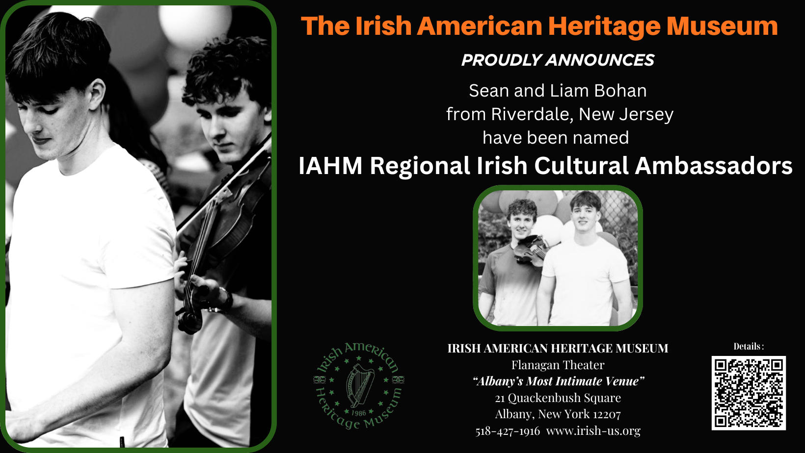 The Irish American Heritage Museum is proud to announce two, new IAHM Regional Irish Cultural Ambassadors, Sean and Liam Bohan. Sean and Liam - from Riverdale, New Jersey - are alumni of New York’s Catskills Irish Arts Week. As IAHM Regional Irish Cultural Ambassadors, Sean and Liam will represent IAHM - and the Northeastern US traditional Irish arts community - at O’Flaherty’s Irish Music Retreat in Texas, one of the United States’ preeminent and most successful immersive Irish cultural experiences.