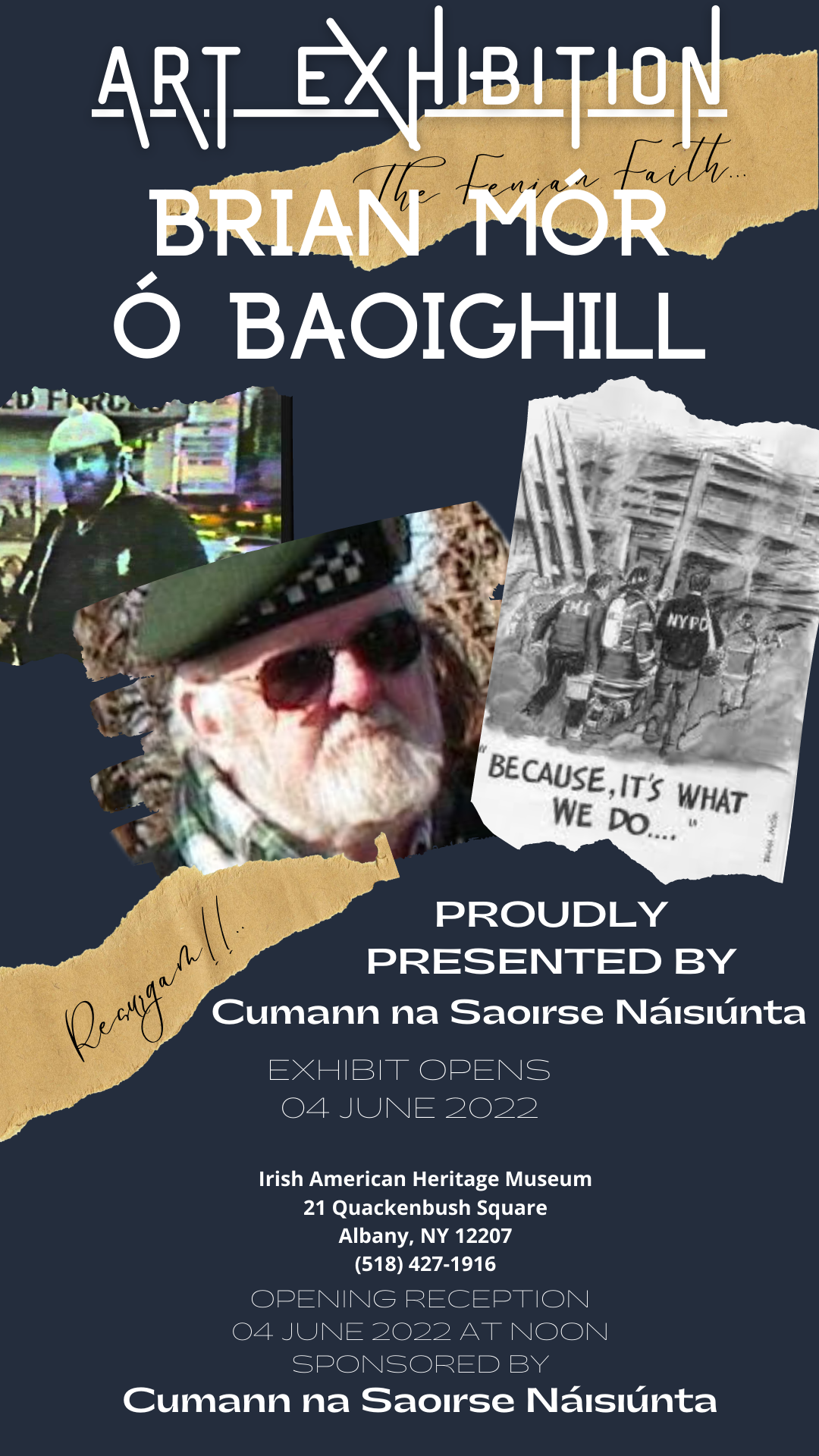 Join us for refreshments and entertainment at the museum for the opening of the Brian Mór Ó Baoighill Art Exhibit, comprised of pieces lent to us by various private owners and Cumann na Saoirse. Brian Mór was born to Irish immigrant parents in New York, and he was a true Renaissance man. The go-to Irish American graphic artist, he designed album covers for Black 47, Joannie Madden, Cherish the Ladies and Seanchie. His artwork filled both the old and new Rocky Sullivan’s Bar. Mór designed a coat of arms for Da Vinci Code author Dan Brown, illustrated Christmas cards, and designed a line of Irish China. His artwork is hung in the Bloody Sunday Museum in Derry, Ireland. Mór was one of the founders of Behind the Green Curtain on WBAI, which eventually became Radio Free Éıreann, and he was an active contributor until his death in 2012. Ironically earlier that year, Mór’s poster memorializing Theobald Wolfe Tone and The United Irishman, first displayed in New York City Hall, was hung in place of a picture of the Queen of England in Belfast City Hall. While Mór rallied against it being hung in a government office in Ireland still under British rule, somehow, his admirers believed it fitting that it was there!