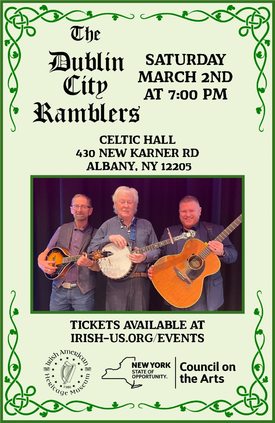 The Irish American Heritage Museum presents The Dublin City Ramblers live at Celtic Hall (430 New Karner Road Albany, NY 12205) Saturday, March 2nd, 2024 at 7pm!