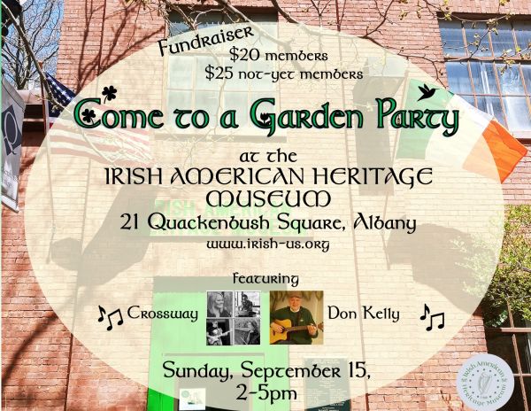 Please join us in the museum courtyard on September 15th 2-5pm for a Sunday afternoon garden party. This event is rain or shine. There will be music, singing, food and drink, and high Irish spirits. Please note the bar will be cash only.