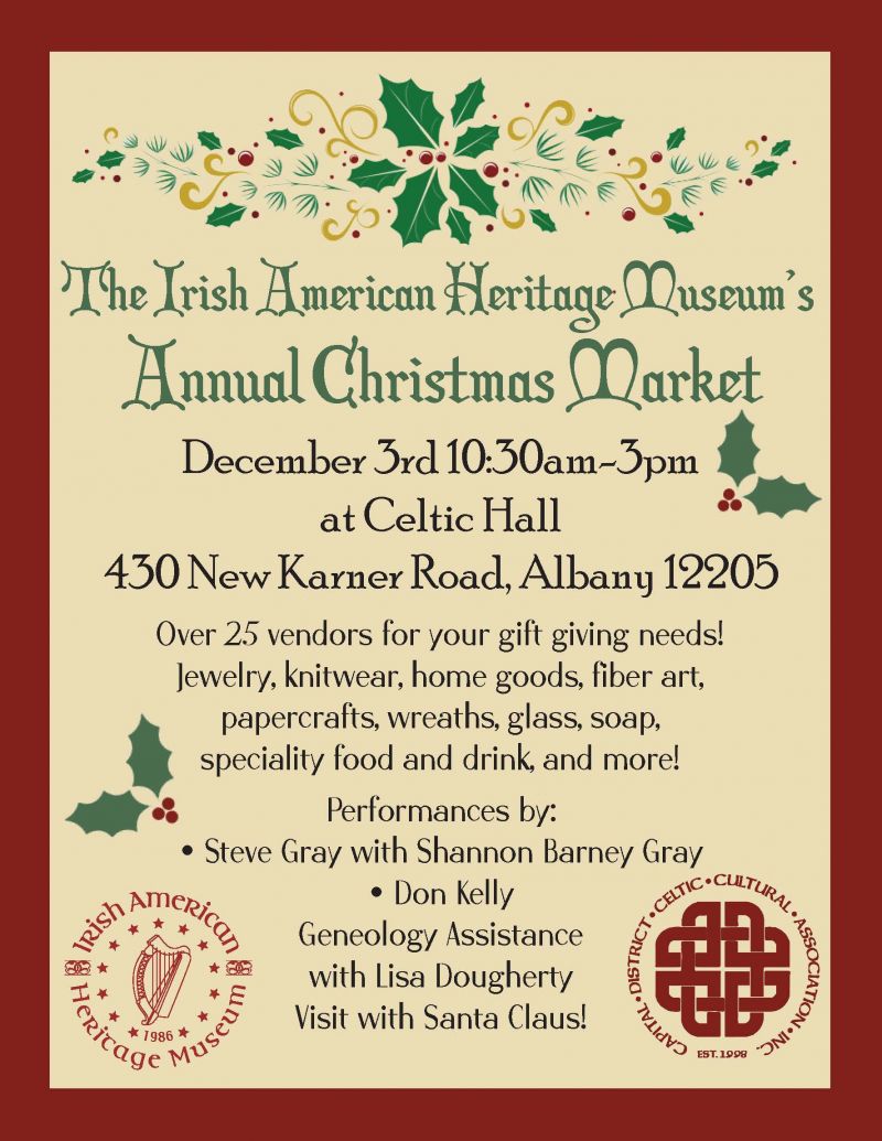 This is always a special day with over 25 vendors selling a variety of handmade gifts and goods, as well as Irish food, raffles, and live performances by Steve and Shannon Grey, Irish Don Kelly, and An Clar School of Irish Dance. Come out and shop in person for the holidays.