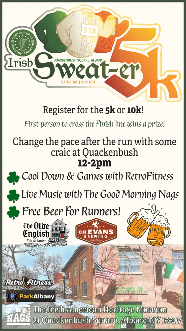 Join us for our annual fundraising run and to kick off Irish American Heritage Month! This year, the Sweater Run will begin and end in our Quackenbush Square and will incorporate Albany's recently opened Skywalk. Please see the Site Map here. There are bathrooms at the Museum and in the Quackenbush Garage - enter from the Lot side.
